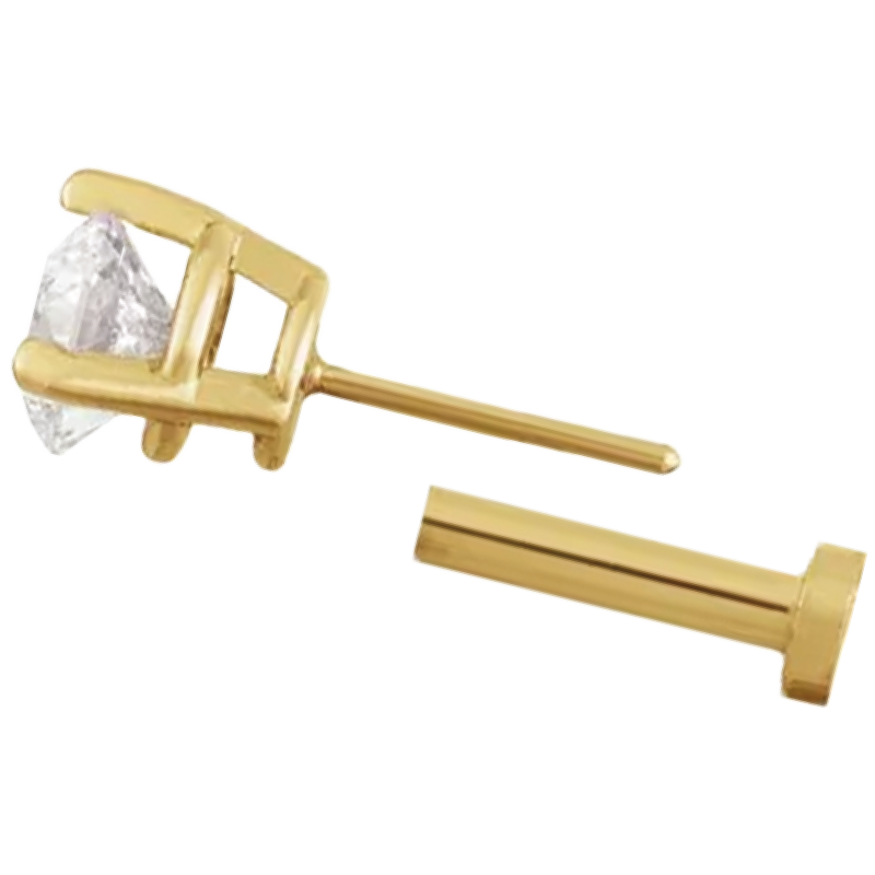 Designed to stay in and stay put. No Backing Out is our collection of threadless, flat-back studs – built for cartilage, healing piercings and everyday comfort. Tiny, solid gold pieces perfect for stacking that bring just enough sparkle without ever getting in the way.